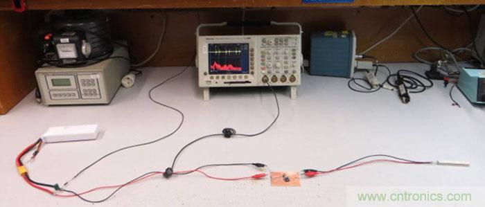 輸入線靠電池一側的接地端通過一只100Ω的電阻和實驗臺的地連接在一起,這就給整個電路提供了一個參考地,其阻抗很像EMC測試中的LISN網絡。