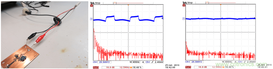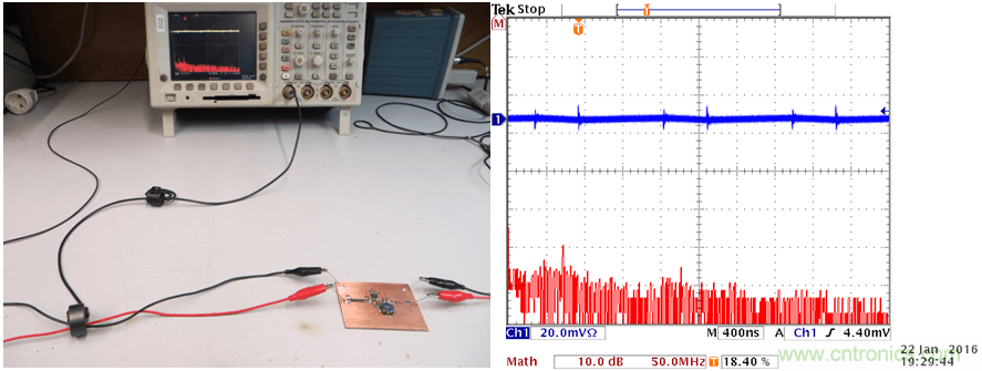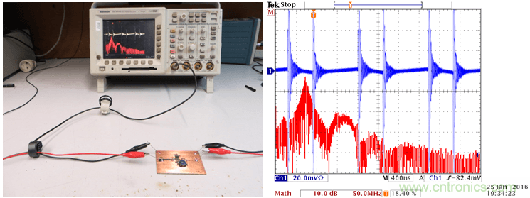 這種環形天線可以被連接到頻譜分析儀上,當你使它在PCB上方移動時,你就可以看到哪里會有比較強的高頻磁場。你也可以把它連接到一臺示波器上(使用50Ω的端子),示波器上就可以顯示出相應區域的切換噪聲水平。保持天線環和板子之間的相對位置和距離不變,對電路、PCB上的回路做出某些改變,你就可以知道噪聲水平在增加或是減少。