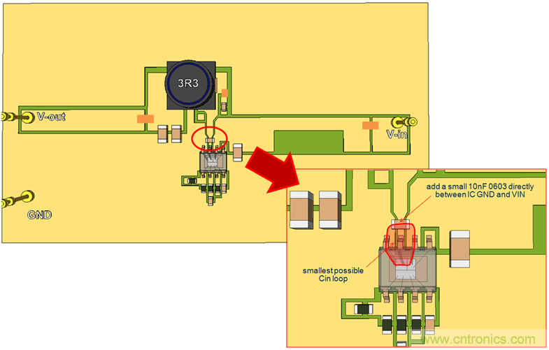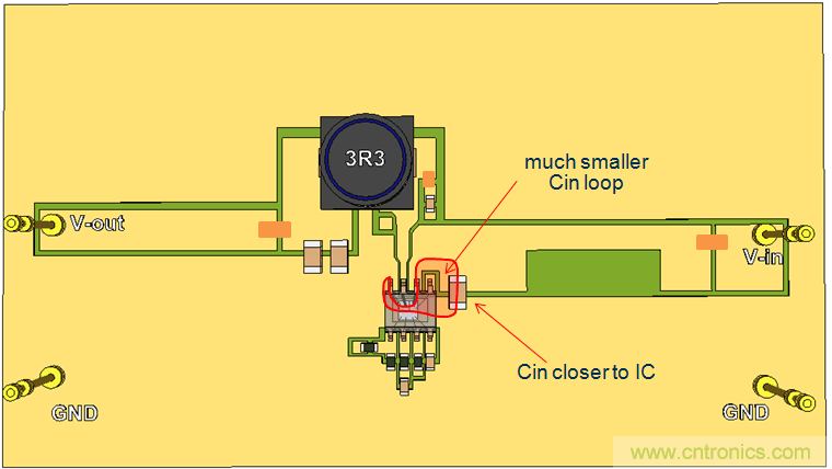 我們繼續使用單面PCB,并將CIN放置到靠近IC的地方,這樣就形成了比較小的CIN回路。參見圖20。