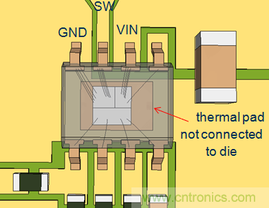 在RT7297CHZSP中,芯片底部的散熱焊盤是沒有和晶圓內核連接在一起的,所以在PCB布局中將銅箔和散熱焊盤連接在一起并不能縮短CIN回路。它的上橋MOSFET和下橋MOSFET通過多根邦定線連接到VIN和GND端子,因而可以通過這兩個端子形成最短的回路。