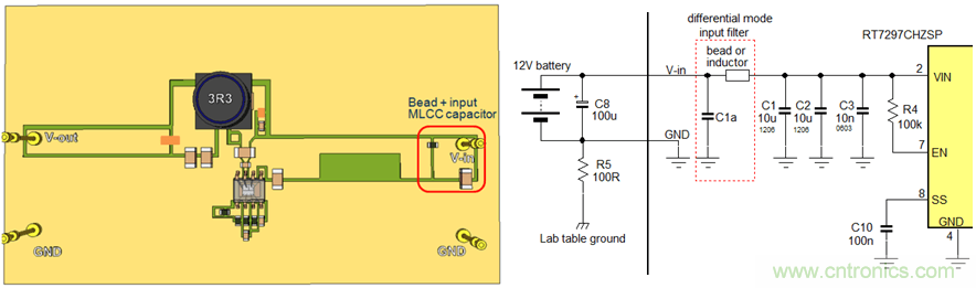 由于Buck轉換器輸入電流的不連續特性和實際為轉換器供電的電源線通常都很長的緣故,輸入回路A3所造成的輻射也可能是很可觀的,并且可導致超出規格的傳導輻射(在150kHz~30MHz頻段),不能通過電磁兼容(EMC)的傳導測試檢驗。