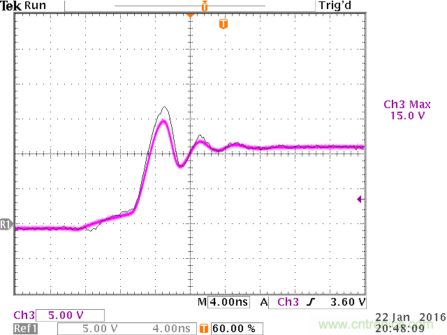 在開關節點和地之間增加一個小電容,這可讓振鈴信號的頻率得到降低。持續增加電容,直至振鈴信號的頻率降低到原始振鈴頻率的50%。