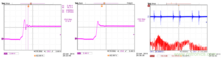 我們也同時看到開關切換波形上出現很高的過沖和振鈴信號,這些信號實際上已經超過了IC的耐壓規格。這些狀況說明錯誤的輸入電容放置位置可以導致很高的輻射和巨大的振鈴信號。
