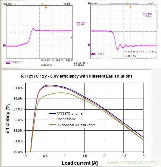 RC平滑抑制電路對效率的影響會比較大,特別是在輕載和中等負載的情況下,但最大也就1~2%,處于可以接受的范圍。需要特別注意的是,當Buck轉換器的工作頻率很高和輸入電壓很高的時候,RC平滑抑制電路對效率的影響會很大。