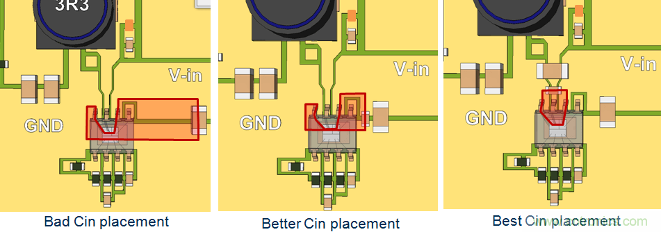 確定開關切換回路的VIN和GND節點位置,將不同尺寸的輸入電容盡可能靠近這些節點,最小的電容靠節點的位置要最近。由于這個切換回路承載了很高的電流變化率dI/dt,因而需要盡可能地小。