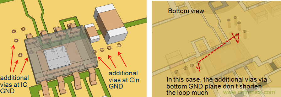 在上面的例子中,通到地線層的附加導通孔對縮減CIN回路的長度沒有幫助。但在另一個例子中,由于頂層的路徑很長,通過導通孔來縮小回路面積就十分有效。