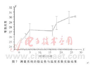 擬合方程顯示在圖中上部的方框里。從實驗結果可看出,一微米位移可獲得變壓器電橋讀數,變化為127.02,輸出特性的非線性誤差小于0.15%F.S.。比率臂第五檔變化一個數對應的位移量根據傳感器結構的不同,一般在5~8納米之間,末級的數據采集器可獲得300多毫伏的輸出,從數據采集器便能夠分辨出0.02納米的變化。在實驗室環境下,傳感器測值隨著溫度的變化會產生極大的漂移,用標準元件來檢查變壓器電橋測量系統的溫度系數與穩定性,所得結果見圖7。在28小時的實驗期間測值等效變化僅為0.1納米,環境溫度變化為3~4℃。作者還曾將差動電容式位移傳感器放到100米深的鉆井底部,那里溫度的年變化不到0.03℃,整個位移測量系統月漂 移率僅為0.1納米[3]。