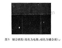 目前真空腔的形成多采用Si—Si鍵合或者陽極鍵合。本方案采用陽極鍵合,是因為陽極鍵合比Si—Si鍵合的要求低。首先溫度只需要400~500℃,其次表面光潔度要求也相對較低。本工藝過程中存在金屬電極,不適于用高溫;鍵合面存在高約1400 nm,寬為20μm的電極引線,鍵合面的SiO2經過一定程度的KOH各向異性腐蝕后粗糙度為100nm左右,經過試驗證明,鍵合情況良好(圖5),并具有良好的密封效果。