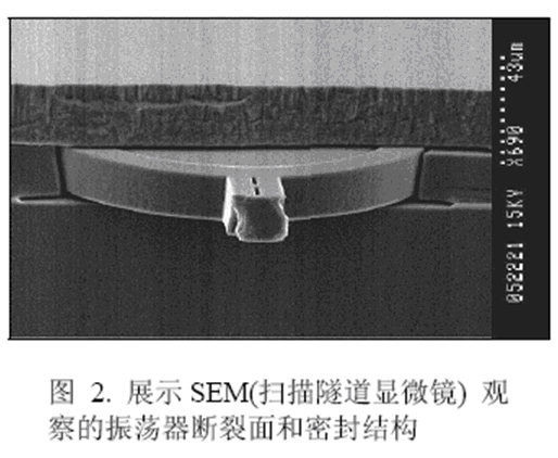 圖2是工藝在接觸與金屬化之前產生的完整的掃描隧道顯微鏡(SEM)結構圖,從中可看到封裝與諧振器的晶圓表面和剖面結構。