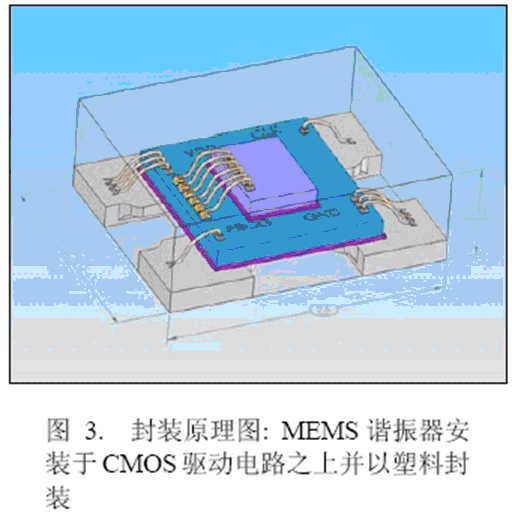 密封的諧振器經過劃片,并以標準的注塑模具進行封裝。圖3給出了一種2.5×2.0×0.85mm塑料封裝的設計原理,即將MEMS諧振器安裝在CMOS驅動電路之上。這種封裝方法經濟有效,是QFN/MLF技術的折衷考慮。它是振蕩器中的一種極小封裝,并且將來尺寸會更小。