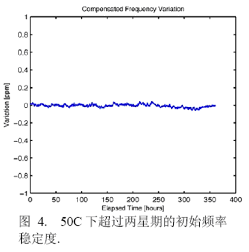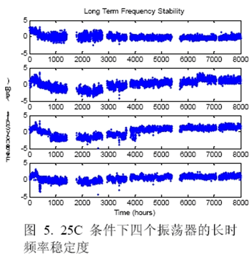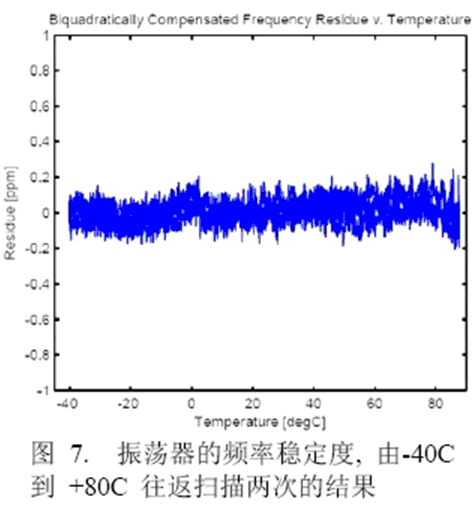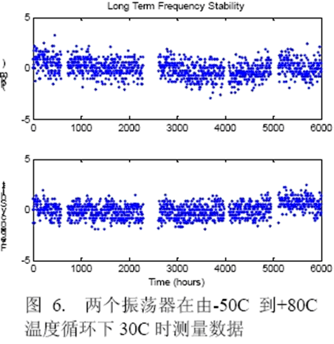 圖6顯示了在進行溫度循環試驗時兩個振蕩器的頻率穩定度。數據在-50℃到+80℃正溫度循環和負溫度循環中的30℃情況下獲得,數據采集自600個溫度循環,以3ppm為規范容許范圍則沒有頻率漂移。