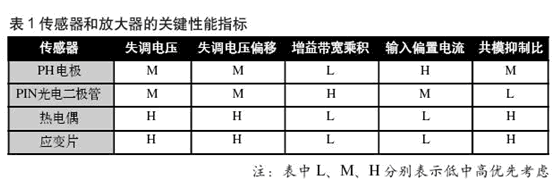 選擇放大器與傳感器正確接口時,設計人員必須使放大器與傳感器特性匹配??煽康姆糯笃魈匦詫τ趥鞲衅?mdash;—放大器組合的工作是關鍵性的。傳感器和放大器的關鍵性能指標見表1。例如,PH電極是一個高阻抗傳感器,所以,放大器的輸入偏置電流是優先考慮的(表中的H)。PH傳感器所提供的信號不允許產生任何相當大的電流,所以,放大器必須是在工作時不需要高輸入偏置電流的型號。具有低輸入偏置電流的高阻抗MOS輸入放大器是符合這種要求的最好選擇。另外,對于應用增益帶寬乘積(GBP)是低優先考慮(表1中L),這是因為傳感器工作在低頻,而放大器的頻率響應不應該妨礙傳感器信號波形的真正再生。