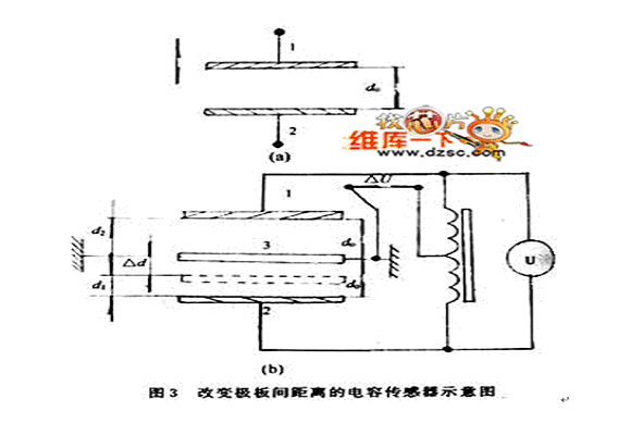 圖3是這類傳感器的原理圖,圖3(a)由2塊極板構(gòu)成,其中極板2為固定極板,極板1為與被測(cè)物體相連的活動(dòng)極板,可上下移動(dòng)。當(dāng)極板間的遮蓋面積為S,極板間介質(zhì)的介電常數(shù)為ε,初始極板間距為d0時(shí),則初始電容C0為: