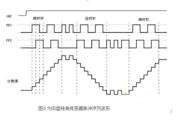 方向盤轉角傳感器的輸出為正交編碼脈沖。正交編碼脈沖包含兩個脈沖序列,有變化的頻率和四分之一周期(90°)的固定相位偏移,如圖5所示。通過檢測2路信號的相位關系可以判斷為順時針方向和逆時針方向,并據此對信號進行加/減計數,從而得到當前的計數累計值,也即方向盤的絕對轉角,而轉角的變化率即角速度,則可通過信號頻率測出。另外,方向盤轉角傳感器有一個零位輸出信號,當方向盤在中間位置時,該信號輸出0V,否則輸出5V,通過該信號,可對絕對轉角進行在線校準。