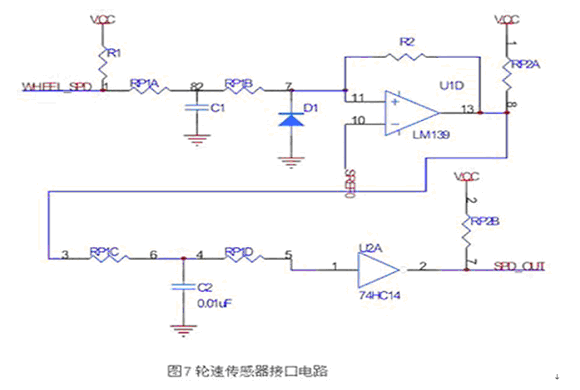 根據前面部分介紹的輪速傳感器信號特點,設計接口電路如圖7所示。