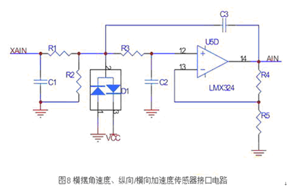 橫擺角速度、縱向/橫向加速度傳感器的安裝位置基本相同,輸出都是0V-5V的模擬量,由于汽車顛簸造成的信號波動特性一致,故封裝在同一模塊中。其硬件接口如圖8所示,實現硬件模擬前置濾波,以抑制來自傳感器的模擬信號中的高頻噪聲成分,防止在采樣過程中出現混疊現象。運放使用滿擺幅輸出的LMX324。