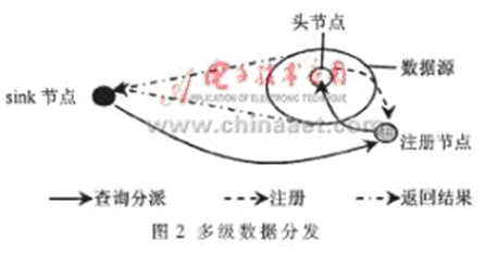 (5)多級數(shù)據(jù)分發(fā)方案(multi-resolution data dissemination scheme)[4],綜合了LS和DCS數(shù)據(jù)分發(fā)方案的技術(shù)。其基本思想是在數(shù)據(jù)源中選擇一個頭節(jié)點,代表源節(jié)點在最近的注冊節(jié)點上進行注冊。sink節(jié)點把查詢發(fā)送到所有注冊節(jié)點上,從注冊節(jié)點再把查詢發(fā)送到所有匹配的頭節(jié)點,當頭節(jié)點收到查詢后,在數(shù)據(jù)源內(nèi)選擇一組節(jié)點進行查詢。由于sink節(jié)點的位置包含在它分派的查詢中,查詢節(jié)點可以直接把感知數(shù)據(jù)發(fā)送給sink節(jié)點,其基本思想如圖2所示。這種數(shù)據(jù)分發(fā)方案避免了查詢泛洪,能有效減少能量消耗。但是在數(shù)據(jù)源中只是基于感知范圍參數(shù)來選擇查詢節(jié)點,沒有考慮數(shù)據(jù)的分布情況。