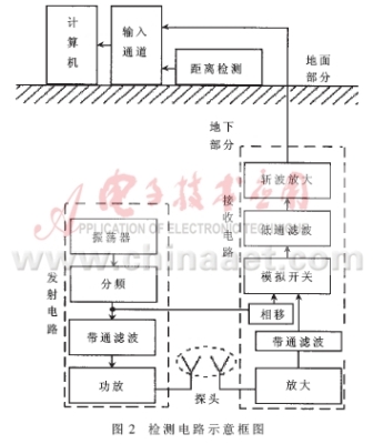 整個(gè)系統(tǒng)分為地上和地下兩部分,其基本組成結(jié)構(gòu)如圖2所示。兩大部分之間通過(guò)電纜相連接。地下部分中包括裝有線圈的探頭以及分別屏蔽在兩個(gè)金屬盒中的發(fā)射電路和接收電路。地下部分的所有裝置全部固定安裝在一節(jié)經(jīng)過(guò)防水處理的直徑為8cm左右的聚氯乙稀管內(nèi)。為了防止對(duì)探頭檢測(cè)過(guò)程的干擾,設(shè)計(jì)時(shí)應(yīng)該充分考慮地下部分的電路及導(dǎo)線的固定和屏蔽問(wèn)題。