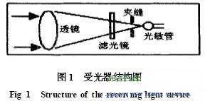 光電傳感器以光為媒介進行無接觸檢測。光是一種頻率很高的電磁波[1]。光干擾也算是一種電磁干擾,光干擾是傳感器誤動作的主要因素之一。環境光、背景光和周圍其它光電傳感器發出的光是光干擾源。以紅外線為媒介進行檢測則可減小可見光的影響,紅外光也不影響可見光。紅外線光電傳感器可用濾光鏡濾去可見光。對于周圍環境其它光電傳感器的光干擾,可用外殼、套筒、夾縫來抑制[2]。圖1是一種受光器結構圖。