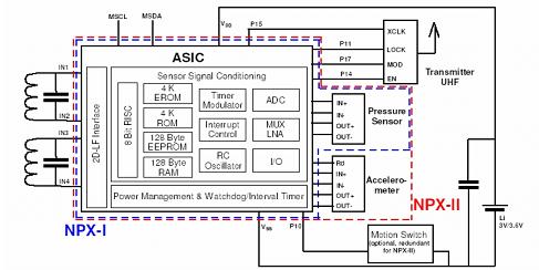 智能傳感器模塊還整合了ASIC/MCU,NPX2和SP30都是使用PHILPS的P2SC的傳感器信號(hào)調(diào)理的ASIC芯片(圖10、圖11),在NPX2的電原理圖中能清晰地看到這個(gè)單元,它包括一個(gè)作運(yùn)算處理控制的8位RISC單片機(jī)、用于安置系統(tǒng)固化程序的4KEROM或FLASH、用于存放客戶應(yīng)用程序的4KROM、用于存儲(chǔ)傳感器校準(zhǔn)參數(shù)和用戶自定義數(shù)據(jù)的128ByteEEPROM、RAM、定時(shí)調(diào)制器、中斷控制器、RC振蕩器,以及將來(lái)自傳感器信號(hào)進(jìn)行放大的低噪音放大器LNA、繼而將傳感器信號(hào)轉(zhuǎn)化為數(shù)字信號(hào)的ADC、與外界聯(lián)系的I/O口、電源管理和看門(mén)狗、斷續(xù)定時(shí)器、1-3維的LF接口。