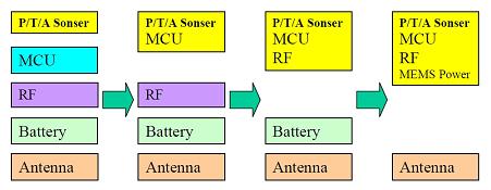 TPMS傳感器模塊技術(shù)發(fā)展趨勢(shì)是將發(fā)射模塊向高度集成化、單一化、無(wú)線無(wú)源化方向發(fā)展(圖12)。隨著TPMS產(chǎn)品市場(chǎng)對(duì)IC高整合度和高可靠性的要求,目前已經(jīng)有了如InfineonSP12/SP30、GENPX那樣的將所需測(cè)試各物理量的傳感器與MCU合二為一的智能傳感器模塊,在未來(lái)幾年內(nèi)還會(huì)開(kāi)發(fā)出包含RF發(fā)射芯片三合一的模塊,包含利用運(yùn)動(dòng)的機(jī)械能自供電的四合一的模塊,屆時(shí)胎壓力監(jiān)測(cè)發(fā)設(shè)器只有一個(gè)模塊和一個(gè)天線組成,客戶的二次設(shè)計(jì)變得十分簡(jiǎn)便。