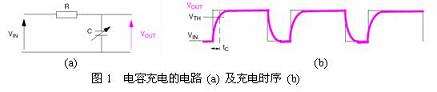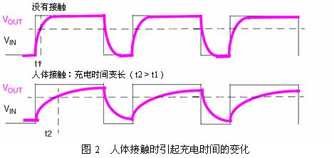 如圖1(a)所示,在RC網絡施加周期性充電電壓Vin,測量Vout會得到如(b)的時序,通過檢測充電開始到Vout到達某一門限值的時間tc的變化,就可以判斷出是否有人體接觸。圖2顯示出有人體接觸時充電時間會變長。