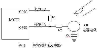 實現電路如圖3,使用一個I/O口對PCB構成的電容充電,另一個I/O口測量電壓,對于多個按鍵時使用同一個I/O口充電。R1通常為幾百K到幾M,人體與PCB構成的電極電容一般只有幾個pF,R2用于降低噪聲干擾,通常為10K。