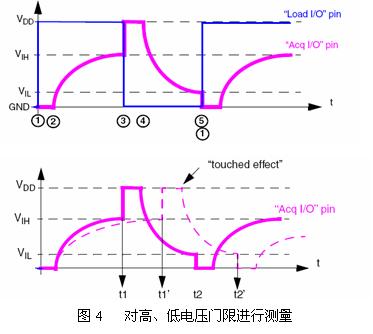 為了提高系統的可靠性和穩定性,改進的測量方法是對Vout進行高和低兩個門限進行測量。如圖4所示,通過對t1和t2的測量,從而達到更可靠的效果。另外,多次測量也是有效的降低高頻干擾的有效方法。