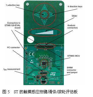 ST公司設計了完整的基于RC充電檢測的電容式感應觸摸方案的完整設計,包括PCB和完整的源程序,以及基于STM8S的標準觸摸感應庫(TouchSenseLibrary:TSL)和應用API接口,采用易于移植的C設計,用戶可以方便地應用于其他任何MCU系統中。因為RC充電理論涉及的專利已經對公眾開放,所以完全沒有專利的限制。