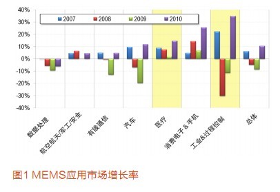 Gartner公司調查總監Stephan Ohr從宏觀上分析了MEMS的增長態勢。Gartner把MEMS分為光學和非光學兩大類。光學MEMS如TI公司的DLP(數字投影芯片)。非光學MEMS傳感器年增長率16.2%(圖2),2010年市場容量會突破30億美元,有望達到31億美元;2009年為28億美元。其中,汽車應用仍然保持非光學傳感器的第一位,占2009年總應用中的60%以上;但是數據處理和通信應用增長最快,數據處理包括硬盤的G-Force(重力)傳感器,通信中包括手機的可旋轉(rational)的傳感和基于位置的服務。