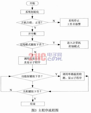 系統上電后單片機首先進行系統初始化,之后程序執行相應的自檢子程序,檢測測溫系統是否有故障。系統默認進入的單機工作模式,在單機工作模式下,可以根據功能按鍵選擇不同的功能,通過系統調用相應的功能按鍵處理子程序來完成應的功能,并在LED數碼管上顯示相應的溫度信息,具有非常好的人性化特點;在無線工作模式下,此時系統作為一個下位機,可以和遠程計算機進行無線通信,實現數據的遠距離傳輸,利用計算機強大的信息處理功能,把下位機傳送過來的數據進行分析和處理。