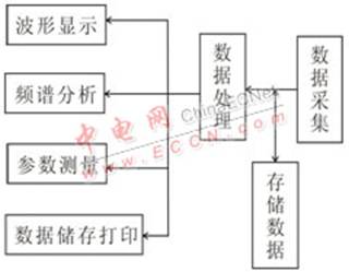 本虛擬軟件將有關測試功能集成在一個面板上,這里著重介紹LabVIEW的框圖程序設計。框圖程序是虛擬儀器的核心部分,虛擬示波器儀器主要由它來完成數據的采集、處理和顯示。本系統框圖程序主要包括數據采集、波形顯示、參數測量、頻譜分析和波形存儲及回放等5大功能模塊,如圖3示。