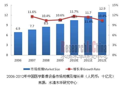 水清木華研究中心指出,近年來,在社會需求劇增、行業(yè)利潤豐厚以及醫(yī)改的背景下,中國醫(yī)學(xué)影像設(shè)備行業(yè)獲得高度發(fā)展。2006至2009年期間,行業(yè)市場規(guī)模從68.7億元人民幣增長至94.2億元人民幣,2006-2009年復(fù)合年增長率為10.9%,預(yù)計(jì)到2012年仍能保持10.4%的增長速度。