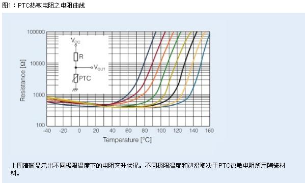 PTC熱敏電阻具有非線性特性:在低溫例如環(huán)境溫度條件下,其電阻較低。隨著溫度的升高,其電阻基于所用陶瓷材料將會(huì)突升。這一閾值又稱作參考溫度或極限溫度。圖1所示為PTC熱敏電阻典型特性。