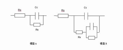 在模型A中電阻器Rs表示金屬所在的溶液,而電容Cc表示金屬表面的保護涂層或涂料,這表示初始涂層的電容。經過一段時間后,水滲入涂層中形成新的液體和金屬界面。隨著金屬的腐蝕,通過溶液與金屬之間的保護涂層形成離子導電路徑。這可以用Rx與Cc并聯模型來表示。另外,有些模型(模型B)還有一個附加的R和C并聯起來再與Rx串聯的電路來表示金屬保護涂層隨著時間變化的分層模型。