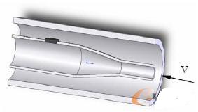 作者所在的研究組在前期應(yīng)用壓力梯度法和壓力互相關(guān)法測量液壓系統(tǒng)流量進(jìn)行了理論和實驗研究,取得了一定進(jìn)展,在此基礎(chǔ)上,提出這種不需要引壓,直接讓 MEMS敏感芯體在管內(nèi)獲得與流量對應(yīng)的差壓信號的新方法。相比之下新方法在對系統(tǒng)較低擾動的前提下更易獲得較高的信號水平,精度能滿足一般液壓系統(tǒng),具有高的動態(tài)測量頻寬。其機(jī)理是利用內(nèi)置于管道中特殊設(shè)計的異徑結(jié)構(gòu)裝置,如圖1所示,對內(nèi)外流體分別產(chǎn)生收縮和擴(kuò)壓雙效作用,獲得低壓損、低能耗的微小壓力差,通過置于上面的MEMS敏感芯體測取,并根據(jù)建立的壓差-流量關(guān)系模型,及仿真手段和實驗測試得出該狀態(tài)下的流量值。
