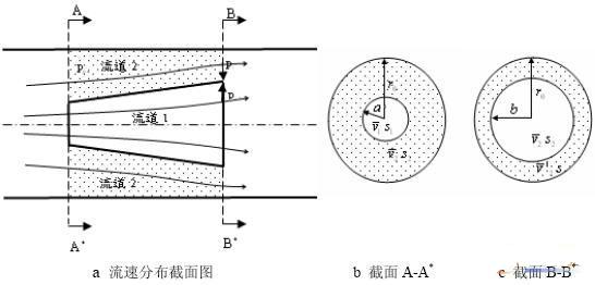 如圖2所示,流體在異徑管內(nèi)外被分為流道1和流道2,在這里,r0為管路半徑,a、b分別為內(nèi)流道入口和出口處半徑,忽略異徑管厚度,因此a、b也是外流道的進(jìn)出口處內(nèi)徑,假設(shè)從截面A-A*到截面B-B*流線不發(fā)生增加或者減少,即任何A-A*面上一微元ds都可以沿著流線找到在B-B*面上的映射 ds*,則在流道1內(nèi)任一流線上有:
