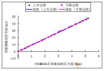在進(jìn)行實驗研究時,選取了一種壓阻式MEMS微型壓差敏感芯體,在組裝傳感器之前,采用了FLUKE 718 10G型壓力校準(zhǔn)儀(Pressure Calibrator)對芯體進(jìn)行標(biāo)定。FLUKE 718 10G型壓力校準(zhǔn)儀通過其自帶的一個主氣泵和一個微調(diào)氣泵可以輸出穩(wěn)定的-12~30psi(-83~207KPa)氣壓,精度達(dá)到±0.05%滿量程。實驗所用的MEMS芯體額定工作壓力量程為6KPa(安全工作壓力十倍于滿量程),在10.00+/-0.01V激勵電壓下,用FLUKE壓力校準(zhǔn)儀標(biāo)定結(jié)果如下: