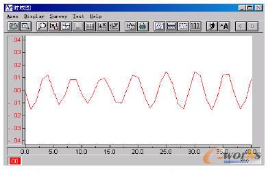 在動態(tài)試驗中,保持液壓泵提供20L/min的工作流量,使用Wavebook512信號系統(tǒng)對MEMS傳感器輸出流量信號進(jìn)行采集,如圖7所示。盡管受到系統(tǒng)內(nèi)閥口、管路等造成的干擾,而且由于柱塞泵各柱塞在制造、安裝以及使用中產(chǎn)生的誤差和磨損造成的不均勻現(xiàn)象,導(dǎo)致流量波動曲線有些變形,但是還是可以很清晰的看出流量的波動周期約為60ms,即頻率16.7Hz。由于電動機(jī)工作在50Hz頻率,額定轉(zhuǎn)速1000r/min,因此相應(yīng)的軸向柱塞泵運轉(zhuǎn)頻率也是1000/60=16.7Hz,這正與上面的測量結(jié)果吻合。