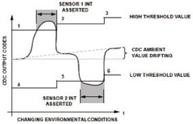 隨著環境條件的變化(例如,溫度或濕度上升),傳感器的環境參數(在用戶沒有與傳感器接觸期間,由CDC進行測量)會發生漂移。為了進行補償,需要動態改變高端和低端閾值電平,以確定有效的傳感器接觸。位置2、3、5、6處的參考電平進行重新調整,以保持最佳的閾值參考電平,從而自動跟蹤和補償漂移誤差。