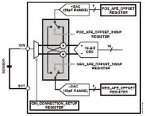 PCB還可能受到寄生電容的影響,這種電容最大可達20 pF,它會在電容觸摸傳感器視為受到按壓時,使閾值發生偏移,從而改變其靈敏度。為了對寄生電容進行補償,可以采用對DAC編程的方法,以抵消CDC的輸入。對于各PCB來說,這種寄生電容是一致的,因此可以在制造PCB的時候進行簡單的調整,這樣就不需要外部RC調諧元件,從而使材料、裝配和測試相關的成本最低。單獨調整每個傳感器的偏移,使設計者可以充分利用轉換器的分辨率(圖3)。