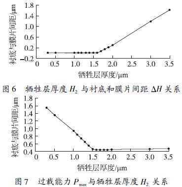利用非線性接觸分析與線性分析的仿真方法,對犧牲層厚度H2在0. 3 μm ~ 3. 5 μm 之間變化時進行具體的仿真,給出了膜片最大應力達到硅的斷裂強度時,襯底和膜片之間的距離ΔH 與犧牲層厚度H2的關系,如圖6 所示。同時也給出了膜片最大應力達到硅的斷裂強度時所施加的壓力載荷Pmax( 過載能力) 與犧牲層厚度H2關系,如圖7 所示.