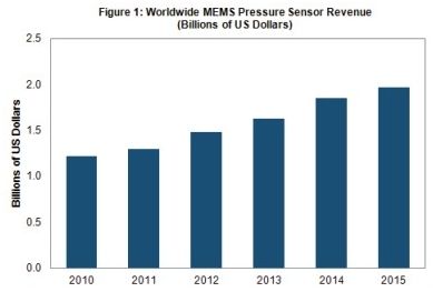 到2015年,MEMS壓力傳感器銷售額將達到19.7億美元,如圖1所示,2010-2015年的復合年度增長率為10%。