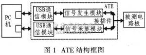ATE測試的原理就是向電路板輸入測試向量,獲取相應的輸出向量,將此輸出向量與正常的響應向量相比較,結果一致表明電路板無故障,否則表明該電路板已損壞。整個過程由ATE自動完成,因此效率高,但測試向量的完備與否對故障診斷結果有重要影響。該ATE設備是針對某電子裝備系統而研發的,其結構框圖如圖1所示。