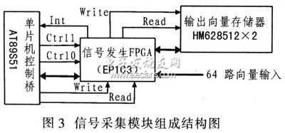 由于被測板是單純的數字邏輯電路,電路板的輸出信號是數字信號,因此信號采集時無須A/D轉換,只需按照一定的采樣周期采集輸出信號即可。由于單片機數據輸入口的位寬一般僅為8位,為了保證采樣速度,利用FPGA器件的內在并行性快速采集輸出信號,并存入存儲器中,在到達測試深度后,FPGA向單片機發送中斷請求,單片機從存儲器中讀取采集到的輸出信號,通過USB傳送到上位PC機。該模塊組成結構如圖3所示。