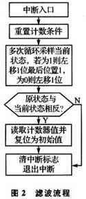 根據(jù)軟件濾波設(shè)計(jì)思想,濾波子程序由主程序在信號(hào)狀態(tài)發(fā)生變化,進(jìn)入中斷時(shí)調(diào)用,圖2給出了濾波程序流程。對(duì)照?qǐng)D1中4種Section來(lái)分析流程圖。當(dāng)有邊沿或干擾信號(hào)(信號(hào)周期大于計(jì)數(shù)時(shí)鐘周期)到來(lái)時(shí),VRS51L3074單片機(jī)的PWC計(jì)數(shù)停止條件滿足,系統(tǒng)進(jìn)入中斷服務(wù)子程序。在中斷子程序中,首先重置脈寬計(jì)數(shù)條件,然后對(duì)當(dāng)前狀態(tài)進(jìn)行采樣,采樣1次,狀態(tài)寄存器左移1位,采樣到高電平記為“1”,采樣到低電平記為“0”。如正常下降沿Section B,前面處于高電平段,初始狀態(tài)變量Flag全為1,當(dāng)出現(xiàn)低電平,控制器進(jìn)人中斷,緊接著進(jìn)行16次采樣。前已提及系統(tǒng)處理的尖峰干擾約1~2 ms,每個(gè)采樣周期約為0.4 ms,其尖峰干擾脈寬達(dá)不到8個(gè)采樣周期。系統(tǒng)設(shè)計(jì)時(shí)采樣16次,只取最后8次的存儲(chǔ)狀態(tài)與原狀態(tài)進(jìn)行比較,如果最后采樣的狀態(tài)全為“0”則與原狀態(tài)相反,就可判斷出這是1個(gè)正常下降沿。如果是干擾信號(hào)引起計(jì)數(shù)中斷,前面8個(gè)采樣狀態(tài)不全為“1”,后面8個(gè)狀態(tài)全為“1”,最后采樣的狀態(tài)與原狀態(tài)相同,就可判斷出這是1個(gè)干擾信號(hào),如Section A。在信號(hào)狀態(tài)采樣期間,計(jì)數(shù)條件滿足PWC繼續(xù)計(jì)數(shù),直到真正的下降沿到來(lái),計(jì)數(shù)停止并保存,計(jì)數(shù)寄存器還原為初始值,這樣干擾信號(hào)即被濾除。類似地,正常上升沿Section D,存儲(chǔ)器原狀態(tài)為“0”,上升沿來(lái)臨后存儲(chǔ)器狀態(tài)為“1”,與原狀態(tài)相反,PWC計(jì)數(shù)停止并保存,計(jì)數(shù)寄存器還原為初始值,退出中斷子程序。有干擾信號(hào)出現(xiàn)后采樣狀態(tài)與原狀態(tài)相同,干擾尖峰脈沖可被濾除。如果要使脈寬計(jì)數(shù)更精確,可判斷前8個(gè)采樣周期中系統(tǒng)不正常計(jì)數(shù)的周期,然后與最終計(jì)數(shù)周期相加即可。此時(shí),程序流程體現(xiàn)出軟件濾波功能。