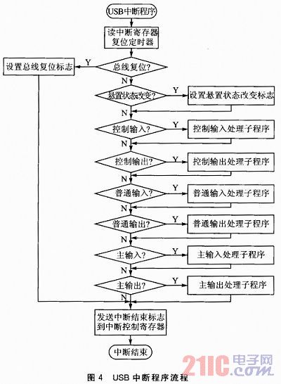因為C8051F321的USB模塊高度集成化,所以對USB接口的設計主要是USB固件程序的設計。其中最重要的是USB描述符和USB傳輸中斷的處理。當USB中斷到達時,C8051F321首先讀取3個中斷寄存器(CMINT、IN1INT和OUT1INT)來判斷中斷來源(USB復位中斷、端點0中斷、端點1輸入中斷、端點2輸出中斷),然后跳入相應的處理模塊進行處理。USB中斷程序流程如圖4所示。