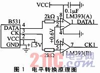 由于容柵傳感器內部的專用控制芯片輸出的信號電壓為1.5 V,而后續數據采集系統工作電壓為5 V,要進行數據交換則必須進行電平轉換,電平轉換原理圖如圖1所示。電路中采用LM393芯片轉換電壓,LM393芯片實質上為2個比較器,比較電壓為容柵傳感器工作電壓的一半左右,設為0.6V。通過比較電壓0.6V與CK和DATA信號線電平比較,即可將CK、DATA信號線的電壓轉換為0V或者5V。
