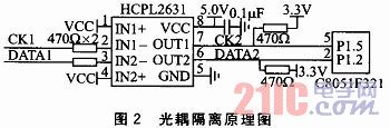 由于系統經常工作在工業現場等領域,各種電磁干擾很常見,為了使系統能穩定工作,采用光耦隔離技術將傳感器和單片機隔離。光耦隔離原理圖如圖2所示。光耦器件采用HCPL2631高速光耦,輸出引腳OUT1和OUT2經過上拉電阻處理后,將CK2和DATA2信號傳輸給C8051F321單片機處理。