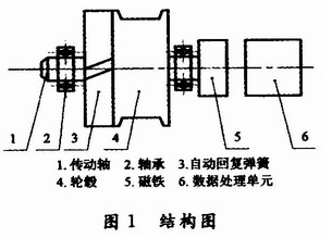 基于磁敏角度技術的拉線式位移傳感器的功能是將拉線的機械位移換成可以計量、記錄或傳送的電信號,主要由自動回復彈簧、輪轂、磁鐵以及數據處理單元等部分構成,結構如圖1所示。